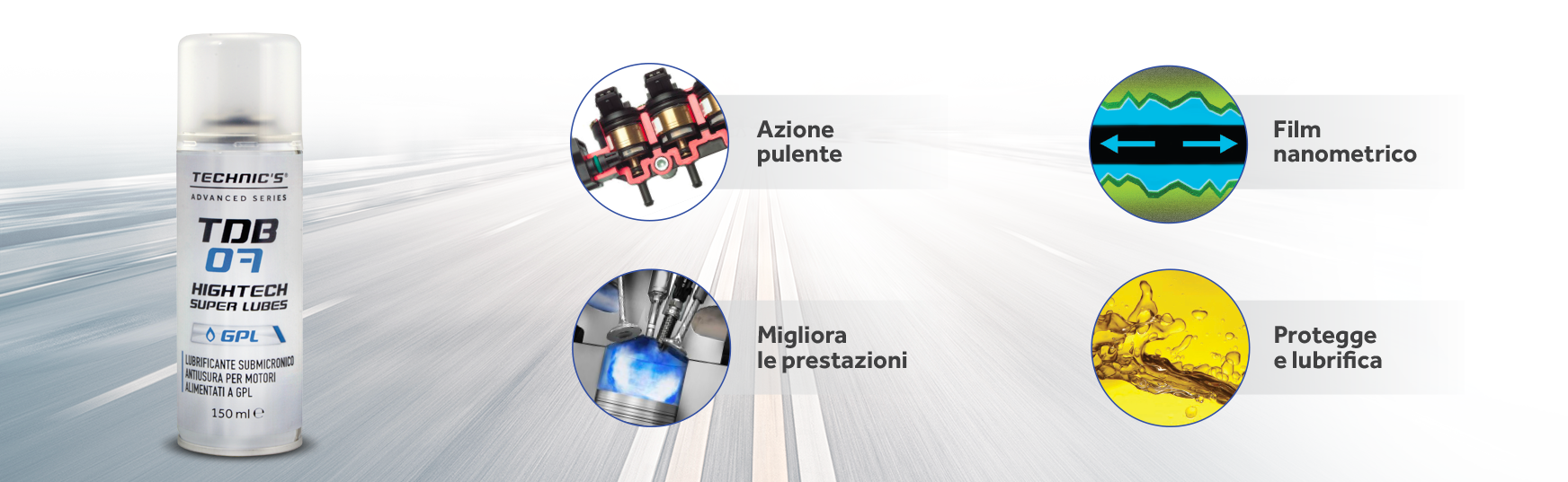 Deterge ed elimina depositi, gomme, lacche, zolfo e ammoniaca dal sistema di alimentazione mentre l’innovativa tecnologia SUBMICRONICA, ricca di particelle Nanotecnologiche lubrificanti, forma un film protettivo sulle superfici soggette ad attrito (iniettori, elettrovalvole e sedi valvole). TDB07 GPL garantisce una lubrificazione di lunga durata, fino a 10.000 km, protegge dal “rinsecchimento” le membrane, gommini e guarnizioni del riduttore di pressione.